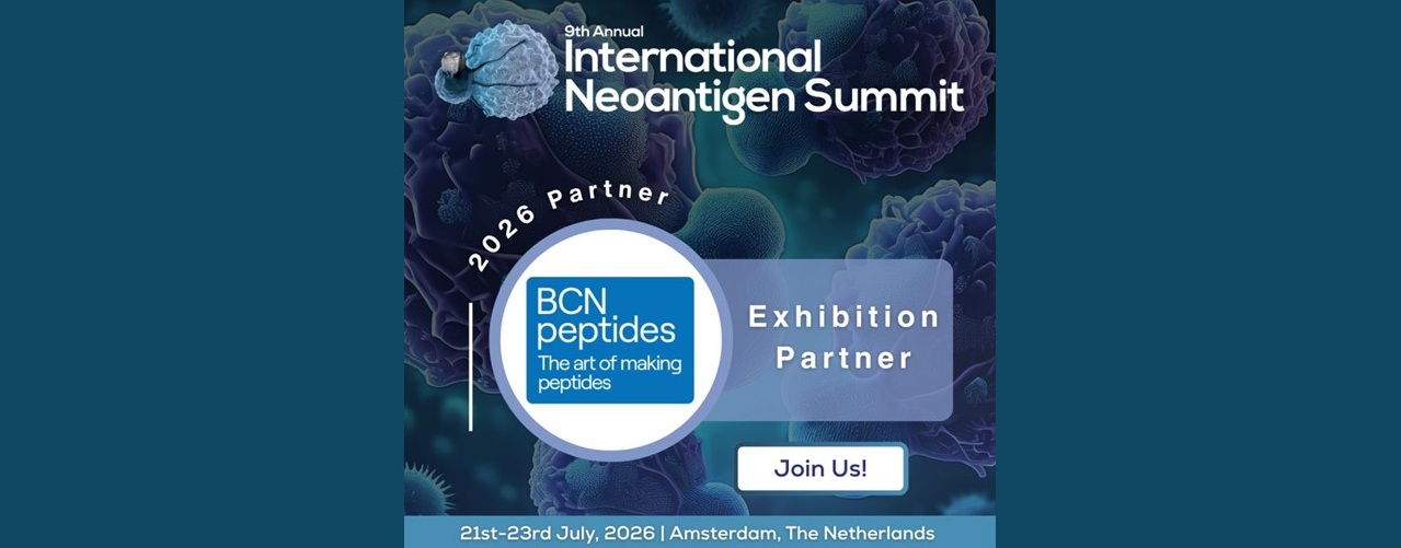 BCN Peptides se enorgullece de regresar como socio para la próxima edición del International Neoantigen Summit, que se celebrará del 21 al 23 de junio en Amsterdam. Con su presencia, la compañía contribuirá al avance de la medicina personalizada y las inmunoterapias contra el cáncer, aprovechando este evento como una oportunidad para apoyar el esfuerzo global en la lucha contra el cáncer mediante la fabricación de péptidos de alta calidad.