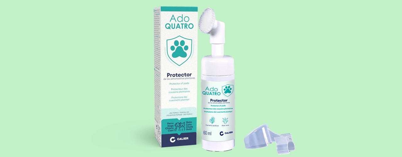 Calier relanza AdoQUATRO, su protector de almohadillas para perros y gatos. Con su formulación de siempre con aloe vera y centalla asiática, este nuevo envase de 60 ml y con esponja de silicona, permite una aplicación más cómoda, rápida y uniforme.