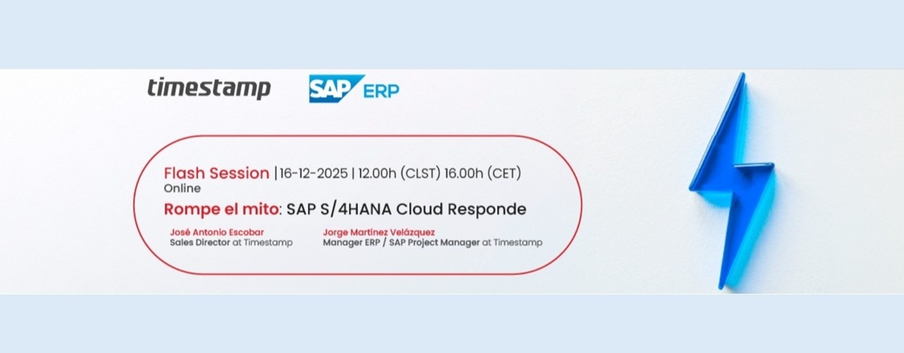 Tras el éxito de la primera edición, Timestamp lanza una nueva Flash Session en horario de tarde bajo el título de Rompe el mito: SAP S/4 HANA Cloud Responde. Se celebrará online el día 16 de diciembre, a las 16:00 horas.